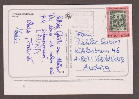 AK Bibione. Gelaufen. Großformat. Verlag: Ganzaroli. Nummeriert: L12. Zustand: rechtes unteres Eck geknickt, leichter Knick über der linken oberen Hälfte.