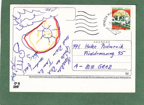 AK Bibione. Gelaufen 1991 in Venezia Marco Polo. Großformat. Zustand: linkes unteres Eck doppelt geknickt, Ecken leicht angeknickt, Knick am unteren Rand in der rechten Hälfte.