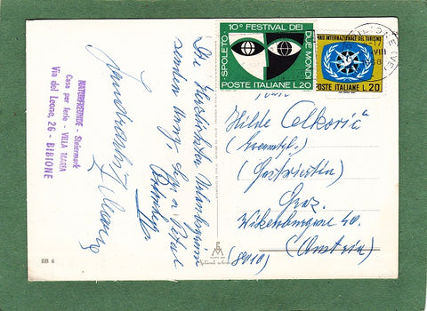 AK Bibione. Gelaufen 1968 in Bibione. Großformat. Verlag: GM Milano. Nummeriert: 6. Zustand: Ecken etwas angestoßen, parallel etwas 1 cm zum unteren Rand „Knick“ dürfte durch Fehldruck oder fehlerhaftes Papier beim Druck der Karte verursacht sein.