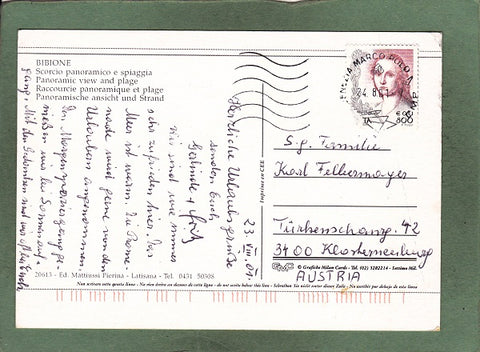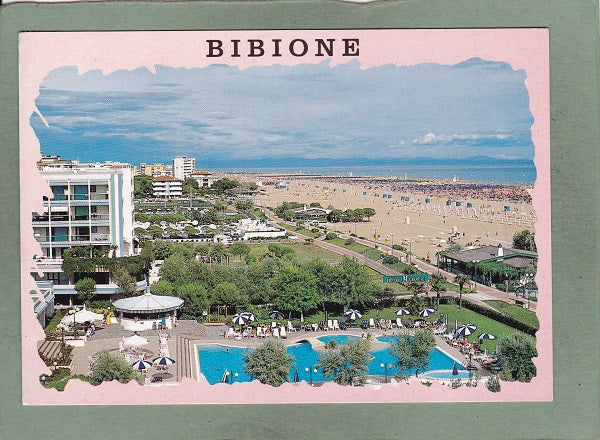 AK Bibione. Scorcio panoramico e spiaggia. Gelaufen 2001. Großformat. Verlag: Mattiussi. Nummeriert: 20613. Zustand: linke Ecken geknickt.