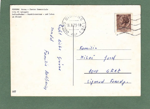 Ak Bibione. Spiaggia. Gelaufen 1973 in Bibione. Aerea – Centro Commerciale – Vita di spiaggia. Großformat. Nummeriert: 107. Zustand: rechtes oberes Eck bestoßen, untere Ecken leicht angestoßen, Knick beim linken oberen Eck, Daumenknick am oberen Rand ca. Mitte.