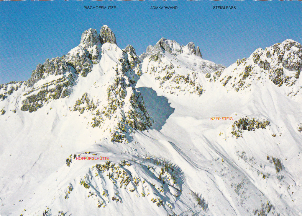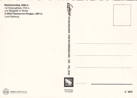 AK Bischofsmütze mit Hofpürglhütte und Steiglpaß im Winter. Filzmoos. Ungelaufen. Großformat. Verlag: Luftbild Scheurecker. Nummeriert: C 2070. Zustand: gut.