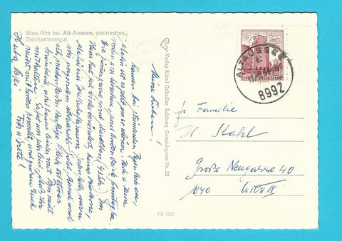 AK Blaa-Alm bei Alt-Aussee. Gelaufen. Großformat. Verlag: Cosy. Nummeriert: FS 1520. Zustand: rechtes oberes Eck geknickt, sonst leichte Läsuren.