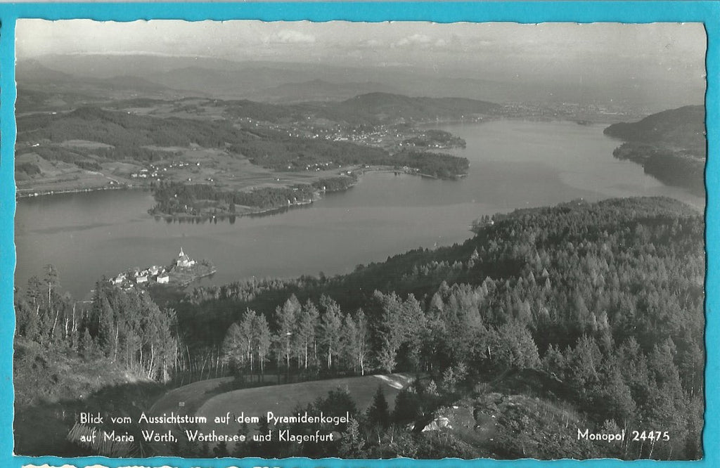 AK Blick vom Aussichtsturm auf dem Pyramidenkogel auf Maria Wörth, Wörthersee und Klagenfurt. Ungelaufen. Kleinformat. Verlag: Monopol. Nummeriert: 24475. Zustand: gut.