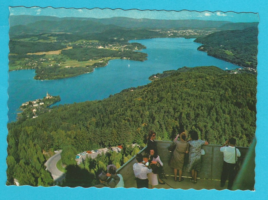AK Blick von der Terrasse des Aussichtsturmes am Pyramidenkogel auf den Wörthersee, Maria Wörth, Krumpendorf, Klagenfurt, Sekirn und Reifnitz. Gelaufen. Großformat. Verlag: Schilcher. Nummeriert: S 15. Zustand: gut.