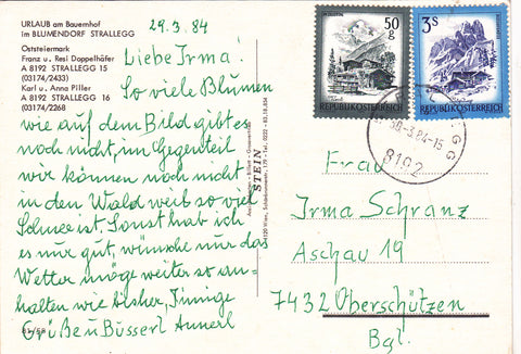 AK Blumendorf Strallegg. Urlaub am Bauernhof. F. R. Doppelhäfer, Strallegg 15. K. u. A. Piller Strallegg 16. Gelaufen. Großformat. Verlag: Stein. Zustand: gut.