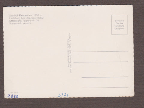AK Eselsberg bei Oberwölz. Gasthof Finster-Lux. Ungelaufen. Großformat. Verlag: Hruby. Nummeriert: 5135. Zustand: gut, rechtes unteres Eck angeknickt.