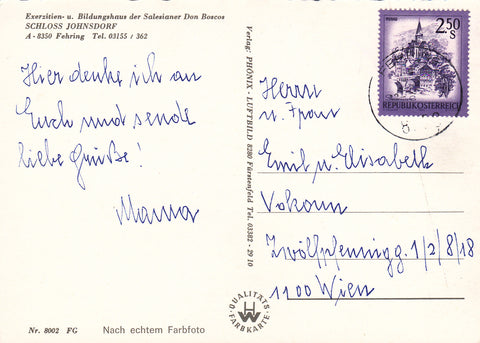 AK Fehring. Exerzitien- u. Bildungshaus der Salesianer Don Boscos Schloss Johnsdorf. Gelaufen. Großformat. Verlag: Phönix bzw. Winkler. Nummeriert: 8002 FG. Zustand: gut.