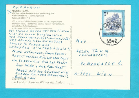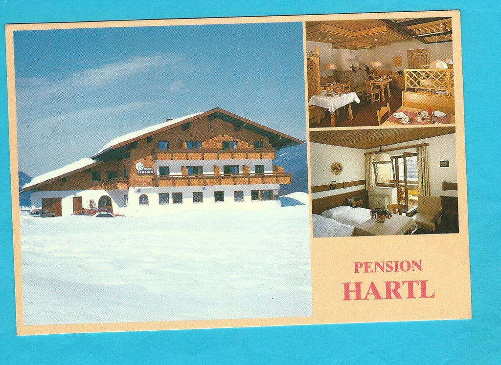 AK Flachau. Pension Hartl. Wilfried und Elisabeth Hartl, Feuersang 214. Gelaufen. Großformat. Verlag: Schneider. Nummeriert: W 124. Zustand: gut, leicht bestoßen.