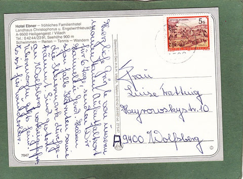 AK Heiligengeist/Villach. Hotel Ebner. Landhaus Christophorus u. Engelwirthkeusche. Gelaufen. Großformat. Verlag: Steinmann. Nummeriert: 7047. Zustand: linkes unteres Eck geknickt, leichter Knick am unteren Rand in der rechten Hälfte, sonst O.k.