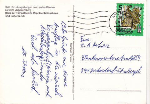 AK Kelt. röm. Ausgrabungen des Landes Kärnten auf dem Magdalensberg. Blick auf Tempelbezirk, Repräsentationshaus und Bäderbezirk. Gelaufen. Großformat. Verlag: Hammerschlag. Zustand: rechtes unteres Eck geknickt, am unteren Rand in der linken Hälfte etwas bestoßen mit Einriss.