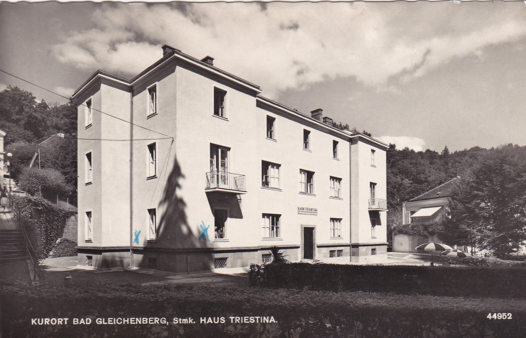 AK Kurort Bad Gleichenberg. Haus Triestina. (1960) Gelaufen. Kleinformat. Verlag: Ledermann. Nummeriert: 44952. Zustand: zwei Kugelschreiberkreuze in linker unterer Hälfte, sonst O.k.
