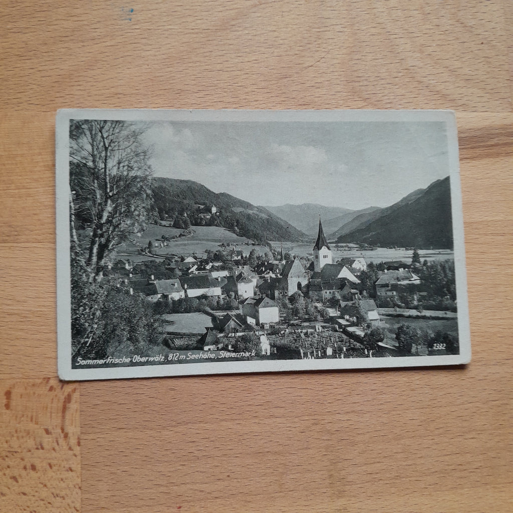 AK Oberwölz. Gelaufen, aber Briefmarke wurde entfernt. Kleinformat. Verlag: Mörtl. Nummeriert: 1332. Zustand: rechtes oberes Eck geknickt.