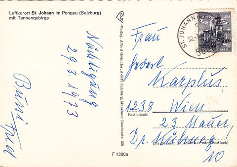 AK St. Johann im Pongau mit Tennengebirge. Gelaufen. Großformat. Verlag: Cosy. Nummeriert: F 1300a. Zustand: gut, linkes unteres Eck angeknickt.