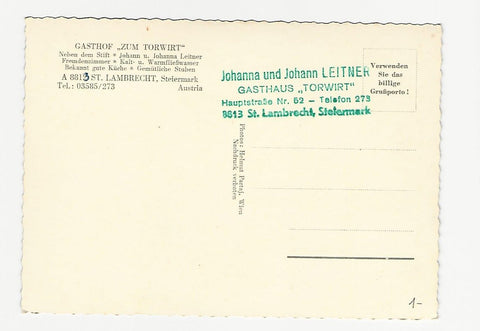 AK St. Lambrecht. Gasthof Zum Torwirt. Johann u. Johanna Leitner. Ungelaufen. Großformat. Verlag: Partaj. Zustand: gut, linkes unteres Eck wenig angeknickt.
