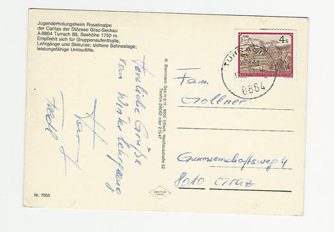 AK Turrach 88. Jugenderholungsheim Rosatinalpe der Caritas der Diözese Graz-Seckau. Gelaufen. Großformat. Verlag: Steinmann. Nummeriert: 7055. Zustand: gut, rechtes unteres Eck geknickt.