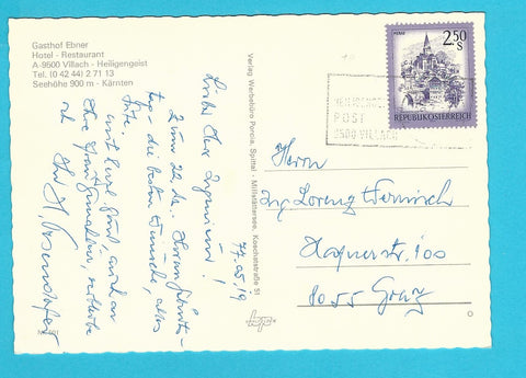 AK Villach-Heiligengeist. Hotel Ebner. Gelaufen. Großformat. Verlag: Porcia. Nummeriert: 501. Zustand: gut, rechtes unteres Eck doppelt geknickt.