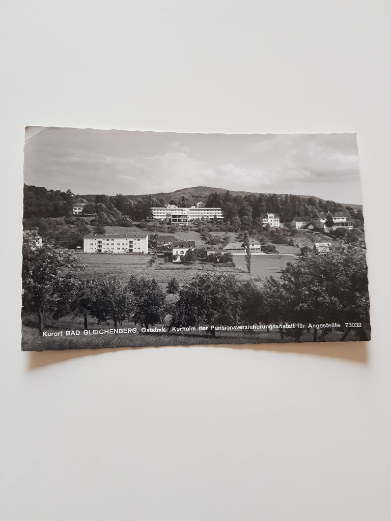AK Bad Gleichenberg. Kurheim der Pensionsversicherungsanstalt für Angestellte. (1962) Gelaufen. Kleinformat. Verlag: Ledermann. Nummeriert: 73032. Zustand: gut, linkes oberes Eck geknickt.