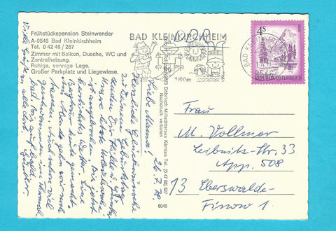 AK Bad Kleinkirchheim. Frühstückspension Steinwender. Gelaufen. Großformat. Verlag: Tollinger. Nummeriert: 6045. Zustand: gut, linkes oberes Eck und am linken Rand angeknickt.