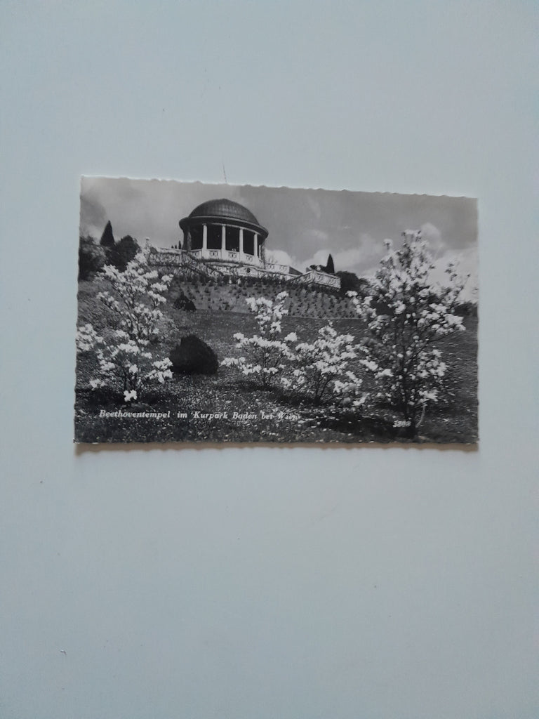 AK Baden bei Wien. Beethoventempel im Kurpark. Gelaufen, aber Briefmarke wurde entfernt. Kleinformat. Verlag: Hubmann. Nummeriert: 3808. Zustand: rechtes unteres Eck geknickt.