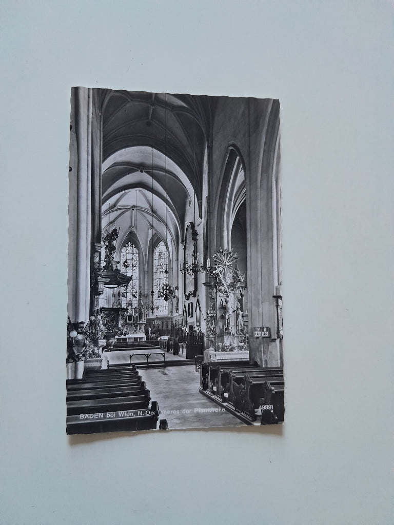 AK Baden bei Wien. Inneres der Pfarrkirche. (1963) Ungelaufen. Kleinformat. Verlag: Ledermann. Nummeriert: 49891. Zustand: Kleberückstände an Rückseite, sonst O.k.