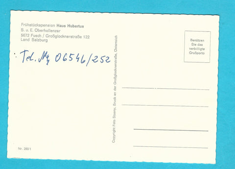 AK Fusch an der Großglocknerstraße. Frühstückspension Haus Hubertus S. u. E. Oberhollenzer. Ungelaufen. Großformat. Verlag: Stiasny. Nummeriert: 280/1. Zustand: gut, rechtes oberes Eck geknickt.