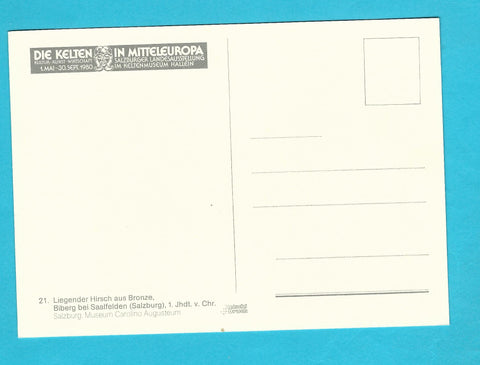 AK Keltenmuseum Hallein. Kelten in Mitteleuropa. Salzburger Landesaussstellung 1980. 21. Liegender Hirsch aus Bronze. Biberg bei Saalfelden 1. Jh. v. Chr. Salzburg Museum Carolino Augusteum. Ungelaufen. Großformat. Zustand: Knick am oberen Rand.