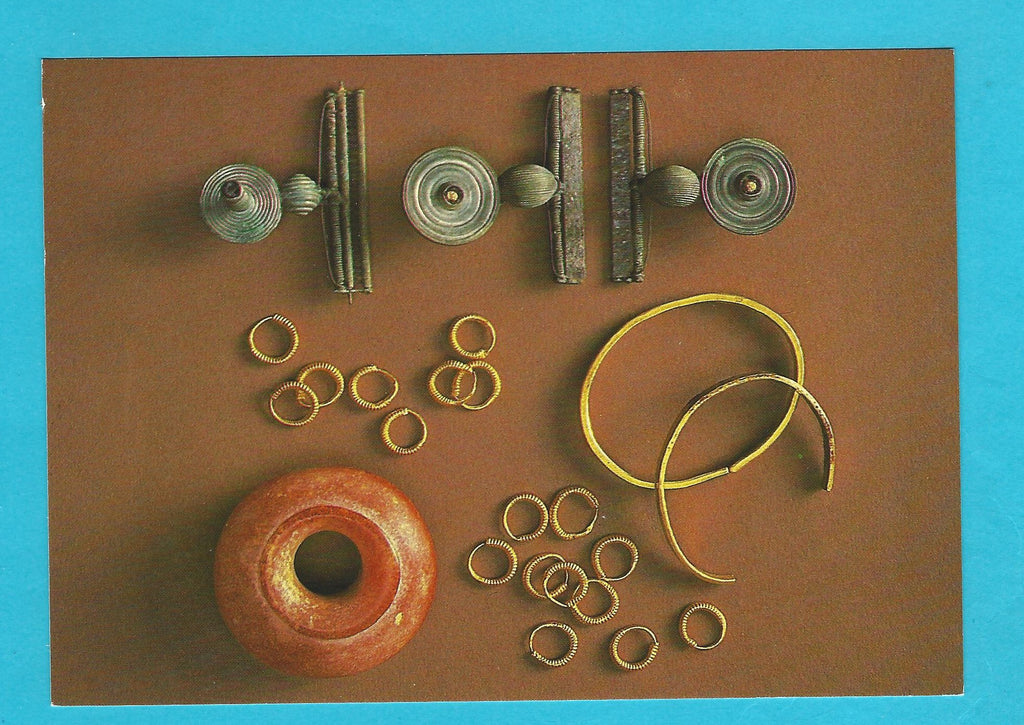AK Keltenmuseum Hallein. Kelten in Mitteleuropa. Salzburger Landesaussstellung 1980. 9. Haargoldringe, Goldarmbänder, Bronzefibeln, Bernsteinring. Hallein-Dürrnberg. 470-410 v. Chr.