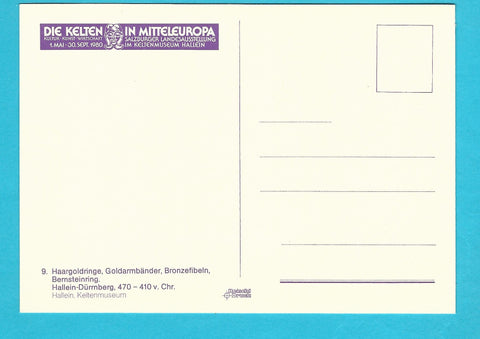 AK Keltenmuseum Hallein. Kelten in Mitteleuropa. Salzburger Landesaussstellung 1980. 9. Haargoldringe, Goldarmbänder, Bronzefibeln, Bernsteinring. Hallein-Dürrnberg. 470-410 v. Chr. Ungelaufen. Großformat. Zustand: gut.