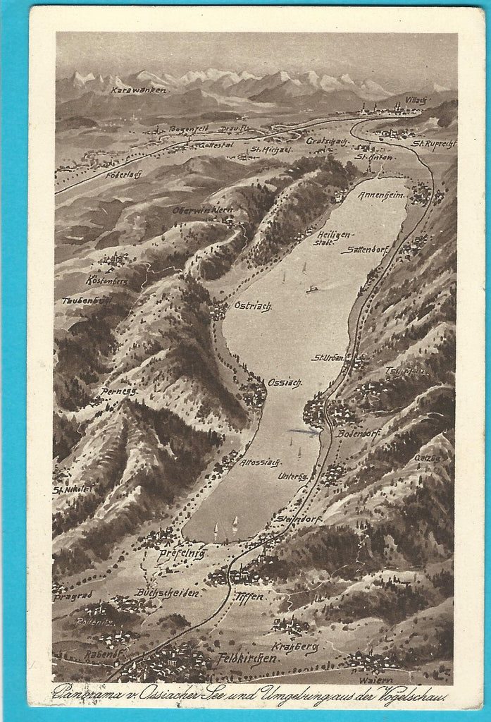 AK Panorama v. Ossiacher See und Ungebung von der Vogelschau. (1924) Gelaufen. Klein format. Verlag: Knollmüller. Nummeriert: 2063. Zustand. gut.