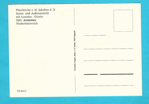 AK Artstetten. Pfarrkirche z. hl. Jakobus d. Ä. Innen- und Außenansicht mit Lourdes-Grotte. Ungelaufen. Großformat. Verlag: Troppko. Nummeriert: 8411. Zustand: leicht bestoßen.
