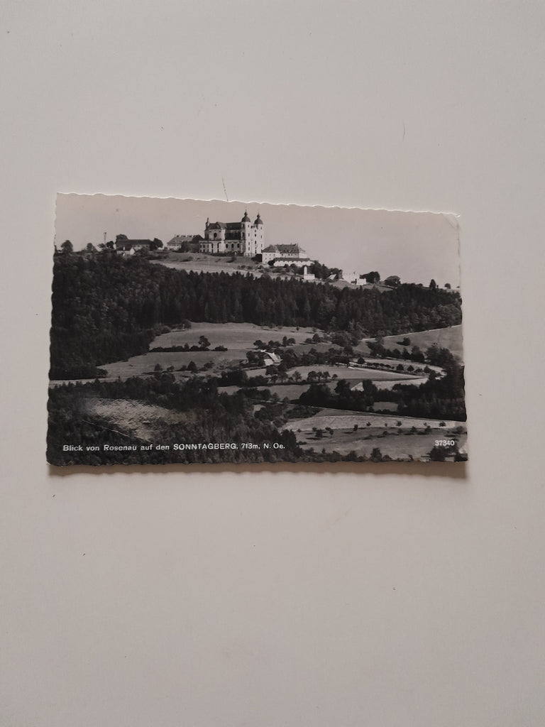 AK Blick von Rosenau auf den Sonntagberg. Gelaufen. Kleinformat. Verlag: Ledermann. Nummeriert: 37340. Zustand: linkes unteres und rechtes oberes Eck geknickt.