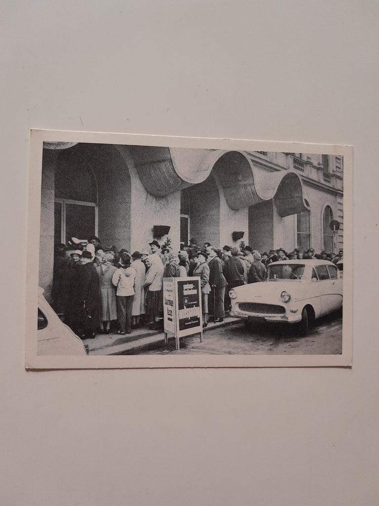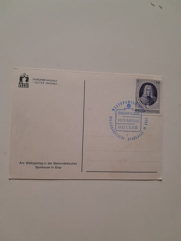 AK Am Weltspartag in der Steiermärkischen Sparkasse in Graz. (1963) Gelaufen mit Sonderstempel und Sondermarke. Großformat. Zustand: gut.