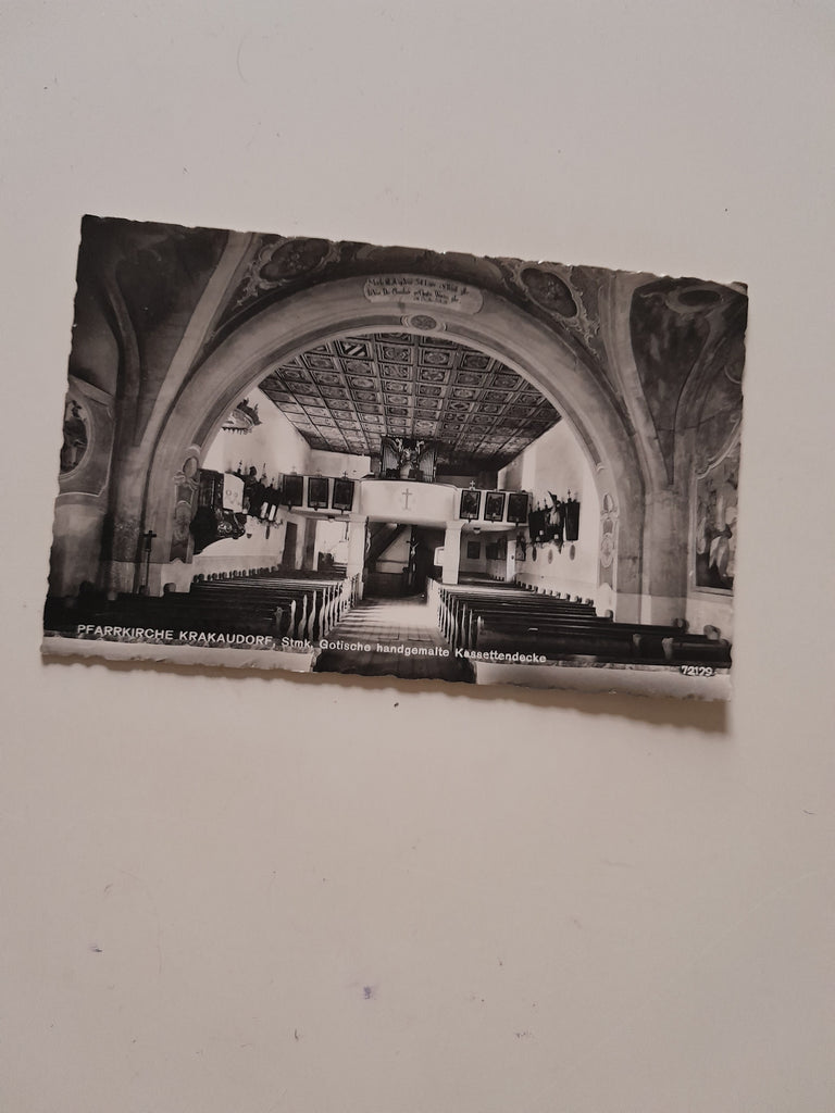 AK Pfarrkirche Krakaudorf. Gotische handgemalte Kassettendecke. Gelaufen. Kleinformat. Verlag: Ledermann. Nummeriert: 72129. Zustand: gut, leichter Knick am unteren Rand.